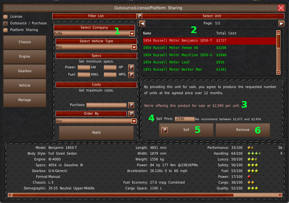 To sell a unit in the Outsource / Purchase system, you'll need to have your company selected in the company filter drop-down (#1). Next, you'll need to select your design from the list (#2). Any green entry is currently not for sale. And any red entries you are selling.