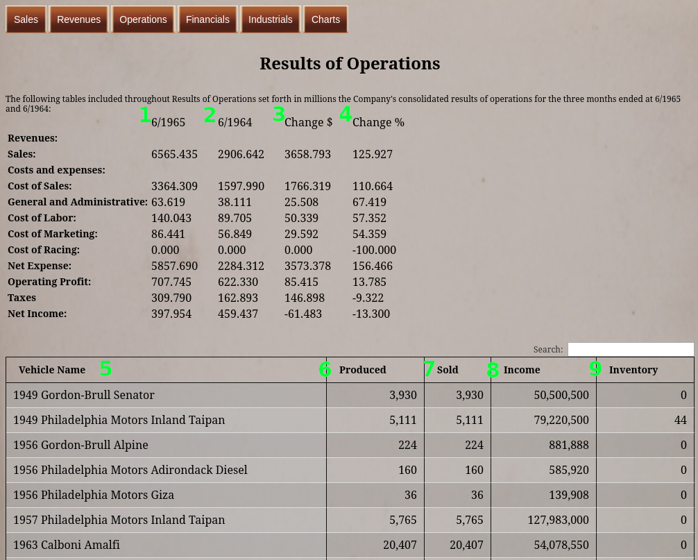 The table contains every vehicle you produced or sold in the quarter. Each model has an entry in the list (#5). The number of units you produced is in the “Produced” column (#6), the number of units sold in the “Sold” column (#7). The table also contains the model's revenues (#8) and the number of units you have in inventory (#9).