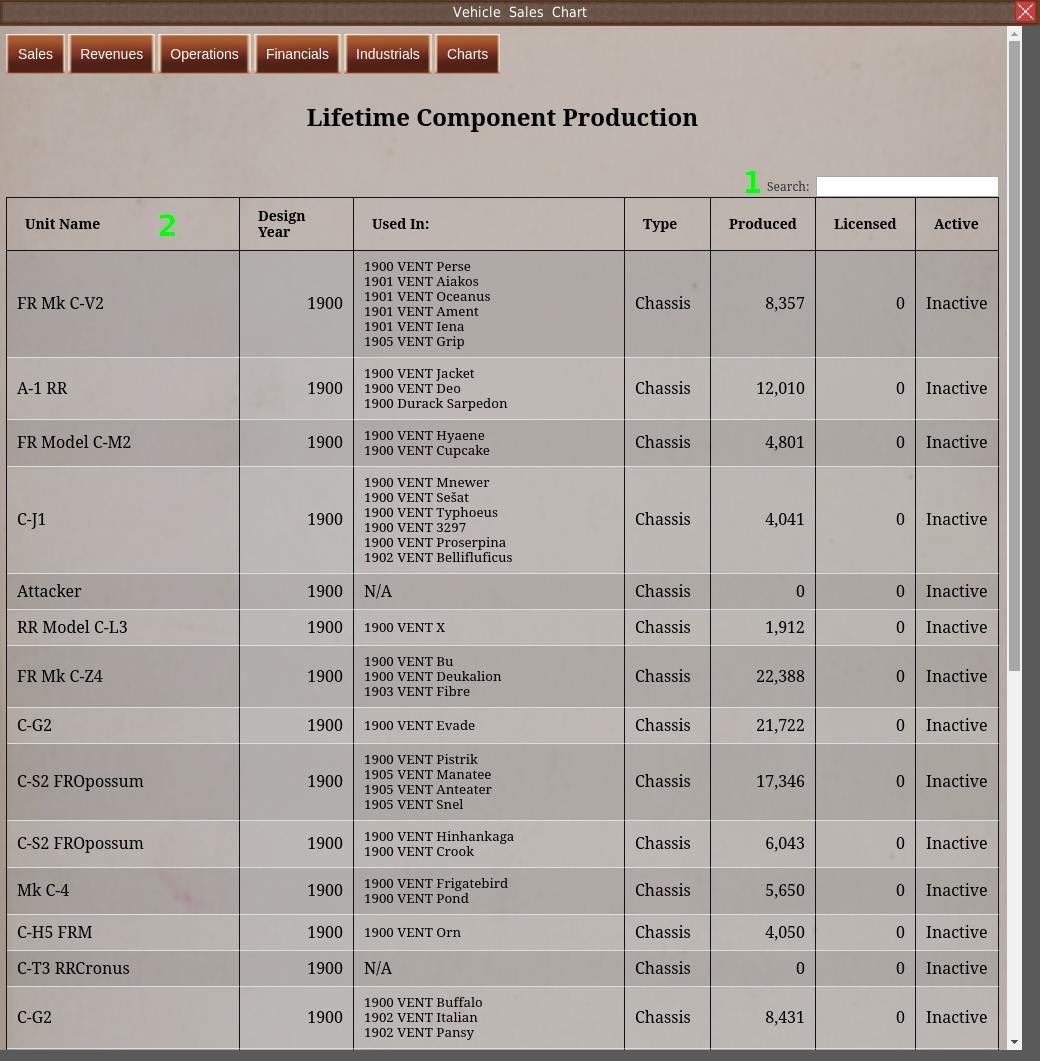 Remember, like all reports in the game, you can search the table with the “Search” textbox (#1). And you can sort the columns by clicking their header (#2).