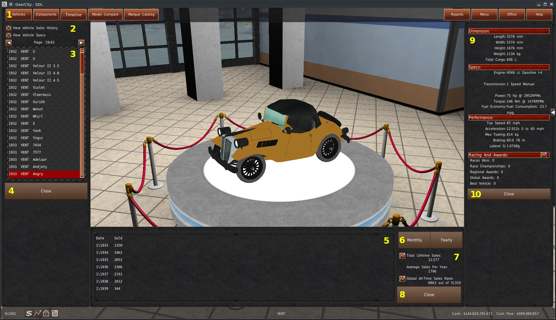 If the “View Vehicle Sales History” checkbox was enabled (#2), a new panel will appear at the bottom center of the screen. This panel contains sales information about the selected vehicle. The large list (#5) displays the vehicle sales based on year or month. The Month and Year buttons (#6) allow you to switch between the two. Just below those buttons are the lifetime sales for the vehicle, average sales, and the all-time sales ranking (#7). There are also graph buttons here to open some charts. If you want to close the central panel, click the “Close” button (#8).