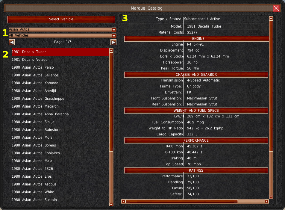 The dropdowns in the top left of the window allow you to filter the listed vehicles (#1). The list below is the vehicles the selected company makes (#2). Selecting a model from this list will load its information onto the right side table (#3).