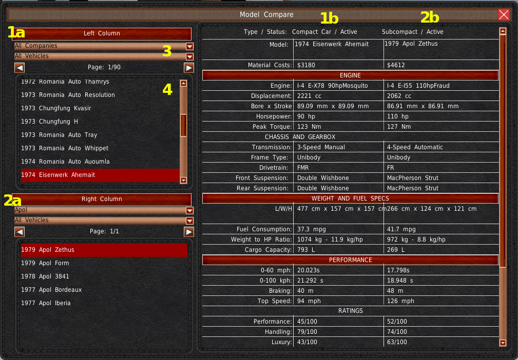 You can filter the vehicle lists by company and vehicle type with the two dropdowns (#3). The list of vehicles is just below that (#4). Selecting a vehicle from the list will load its information into the right side of the window (#1b, #2b).