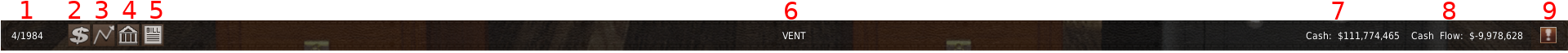 You can find the top bar in all nine interactive states or “Rooms” in the game. These bars contain buttons to launch the main GUI elements for their room. The top bars also share buttons needed for most rooms. When you load a save game, nearly every top bar will have an Office and a Reports button. And every top bar includes a button to open the Help Menu.