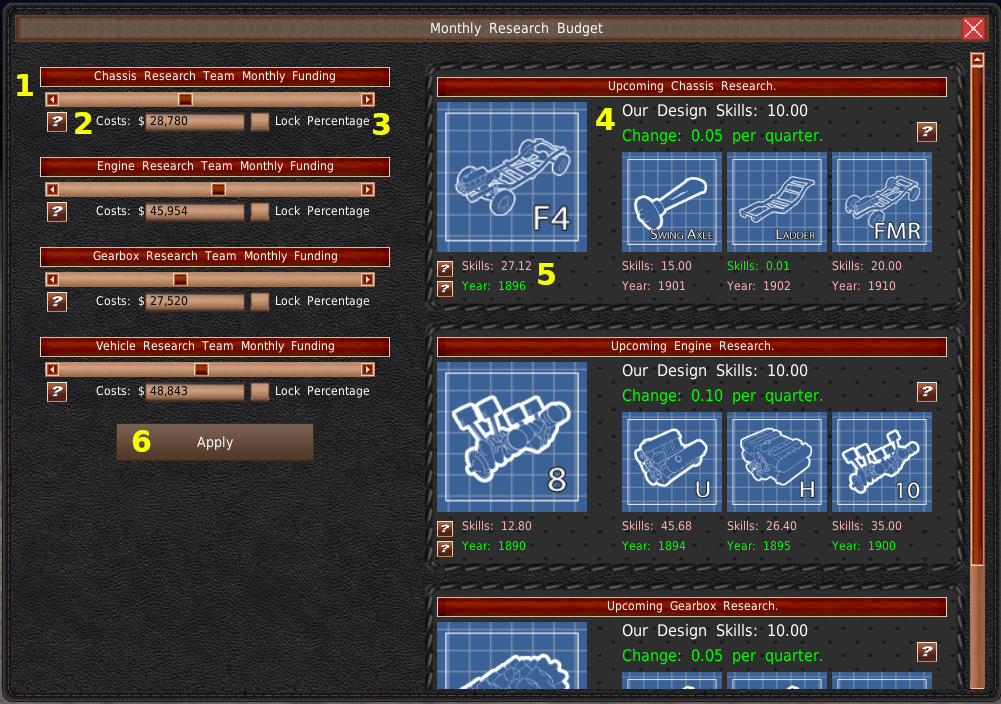 Every year, the maximum budget for research teams increases. To get the same bonus to design skill growth, you'll need to increase your budget by the same amount. The easiest way to do this is to set the “Lock Percentage” checkbox (#3) and then click “Apply” (#6).