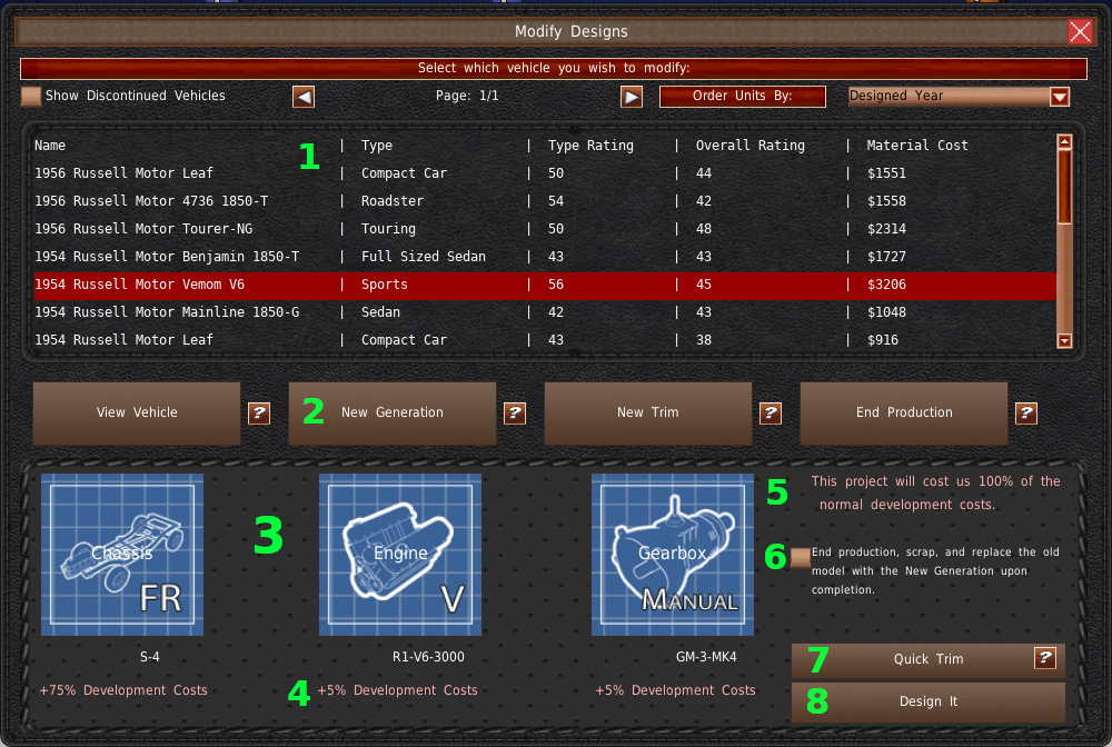 In this panel, you'll find three blue buttons (#3). These buttons are for component selection. Clicking any of these buttons will pull up the component selection window. If you decide to change a component, you'll have to pay additional development costs (#4). The base development cost for a new generation is 15% of a new design's development cost. If you change a component, you'll lose some of the discounts. For a gearbox change, it is only 5%. An engine change is 5%, but it also requires the gearbox development costs for a total of 10%. If you decide to change a chassis, the design will cost the same as designing a new vehicle. You can find the total percentage of development costs in the upper right (#5).