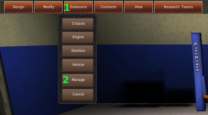 To access the outsourcing system, visit the Research and Development room. Then click on the “Outsourcing” button (#1). A menu will appear, allowing you to select what you want to outsource. The bottom button, “Manage” (#2), we cover in the Outsource, Managing Contracts section of this chapter.