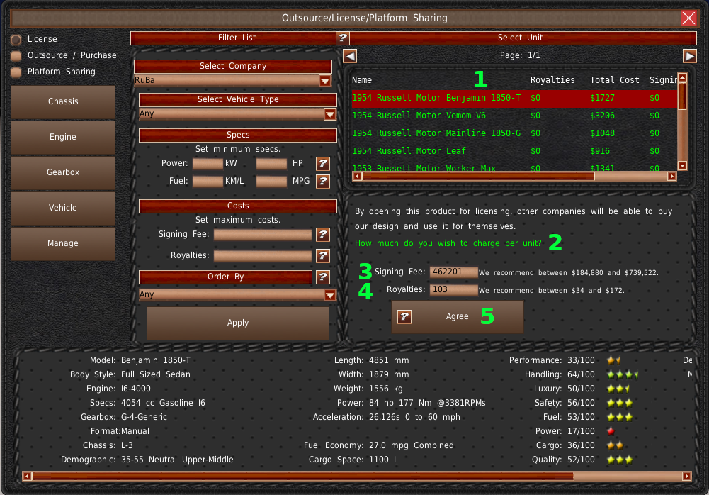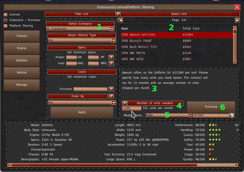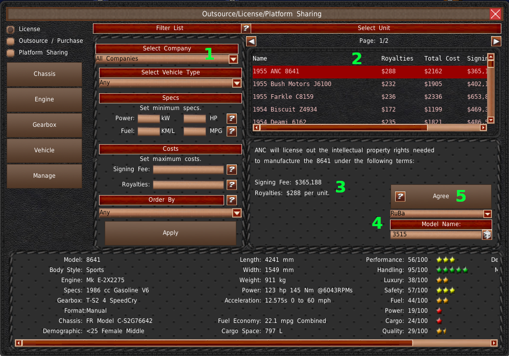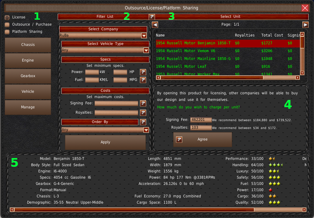 The center panel (#2) is used to filter the model list. In the upper right is the list of models that meet the filter requirements (#3). The panel below the list (#4) is where you'll make your purchase and sales decisions. Finally, spanning across the bottom is the selected model's information (#5).