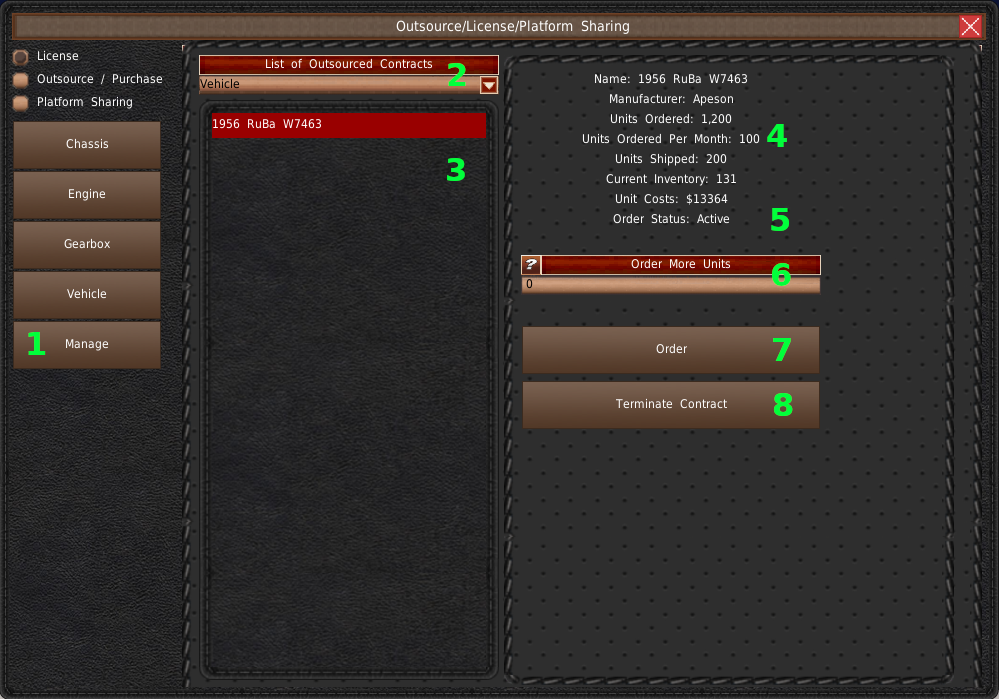 The outsourcing window is divided into 5 sections. The first section is on the left side of the window (#2). This section contains radio buttons to switch between the three methods of outsourcing. And 5 standard buttons to switch between the different component types, vehicle types and to manage outsourced contracts.