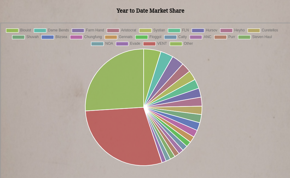 The Recent World Market Share chart contains two different graphs. The top graph is last month's market share for the top 20 companies, your company, and a summation of all other companies. At the bottom is a year-to-date market share graph containing the top 20 companies, your company, and a summation of all other companies. You can click the colored boxes at the top to remove an entry from the charts.