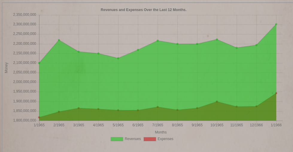 The Yearly Profits/Losses chart overlays a revenues line graph over top of an expense line graph. It's a great way to visualize the financial success of your company over the years.