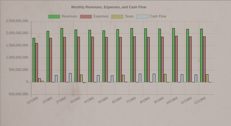 The bar chart provides monthly revenues, expenses, cash flow, and tax payments in one graph.