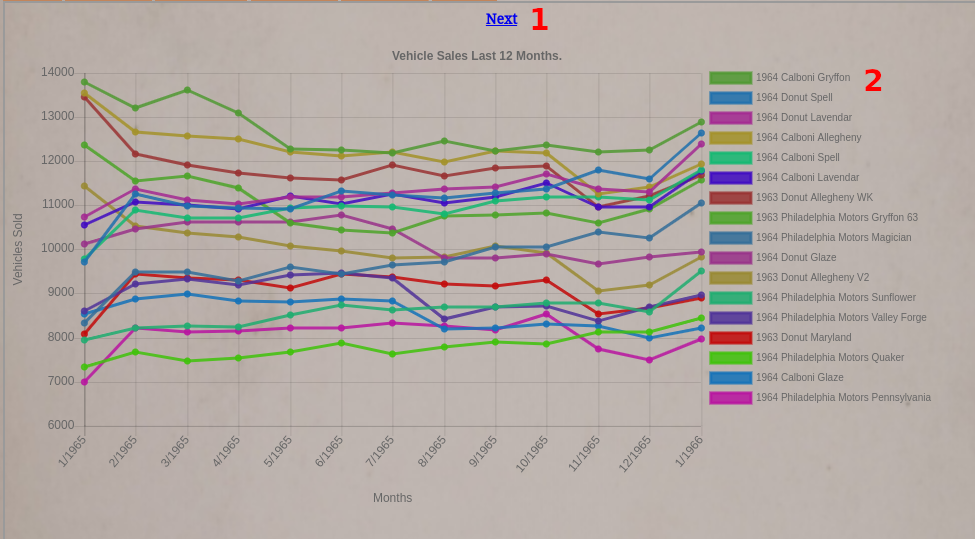 At the top of both of these reports is a “Next” link (#1). This link will take you to additional pages with more vehicles on them. Additionally, you can click the colored blocks on the side (#2) to enable or disable an entry on the graph.