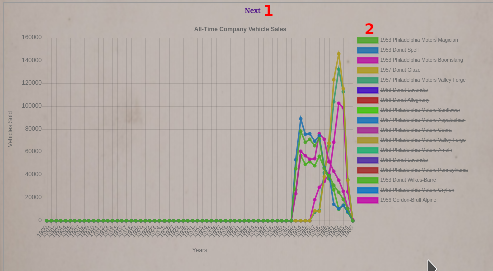 The bottom graph shows all your vehicle sales throughout history. By default, the game does not display inactive vehicle models. You will need to toggle them on to display them.