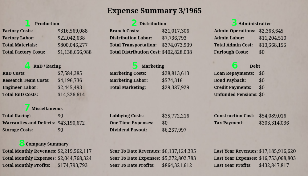 | Warranties and Defects | Warranties contain the expenses from parts failures on vehicles three years old or newer. The game generates this value from the number of vehicles you sold, the dependability rating of the vehicle, and the unit costs of the vehicles. After 3 years, failed parts become OEM Part Revenues instead of being covered by warranties. |