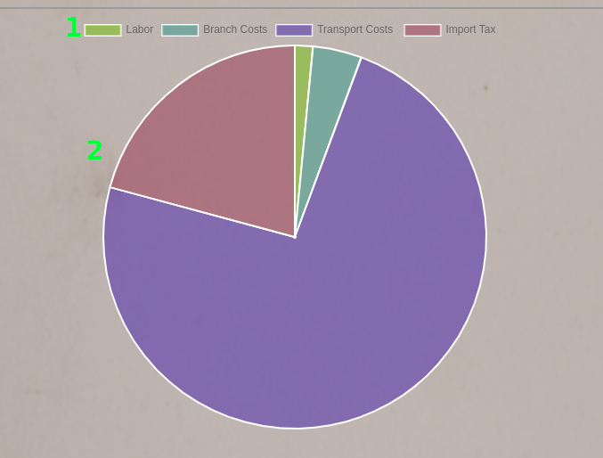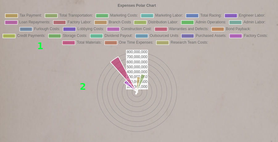 The Branch Report contains two graphs to visualize your operations. The first is a pie chart which breaks down your total branch expenses. Above the graphs are colored blocks (#1). These blocks correspond to the colors on the graph. You can click these blocks to toggle the display of this category in the graph (#2).