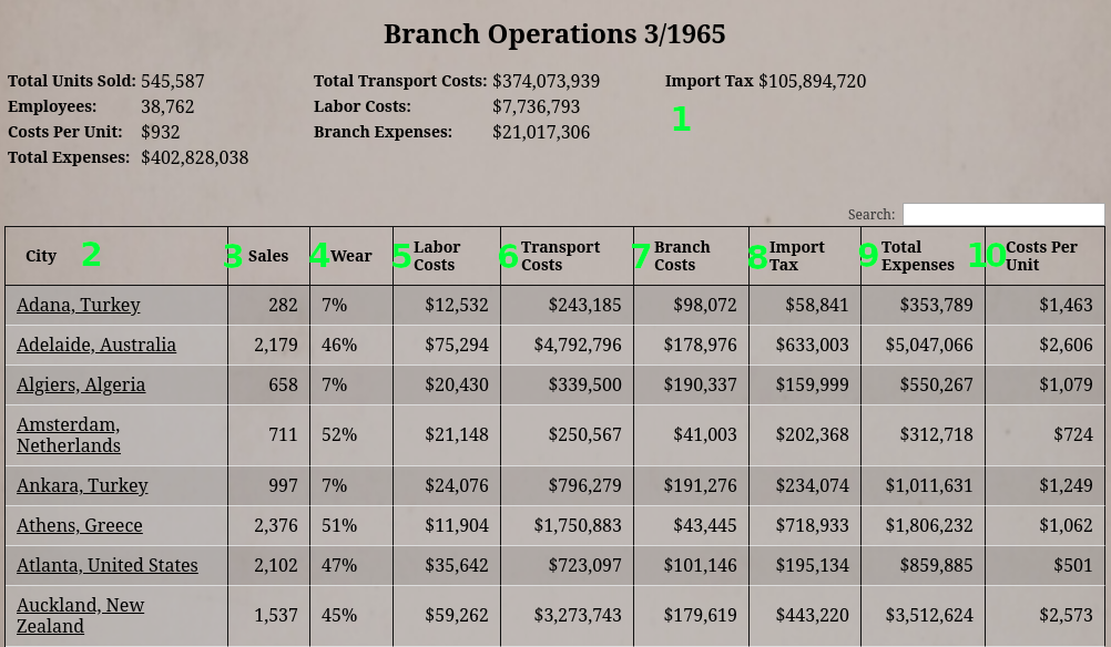 The Labor Costs column (#5) shows how much you're spending on employees at this location per month. You can find the total shipping costs for this location under the “Transport Costs” column (#6). The operation costs for the branch are in the Branch Costs column (#7).