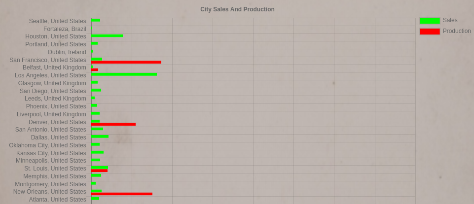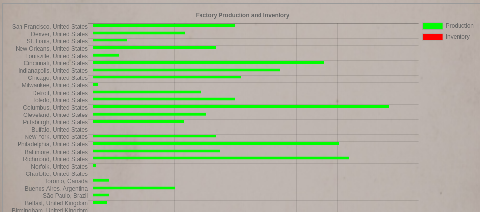 This report contains a bar graph showing each location and displays the factory production amount and inventory levels.