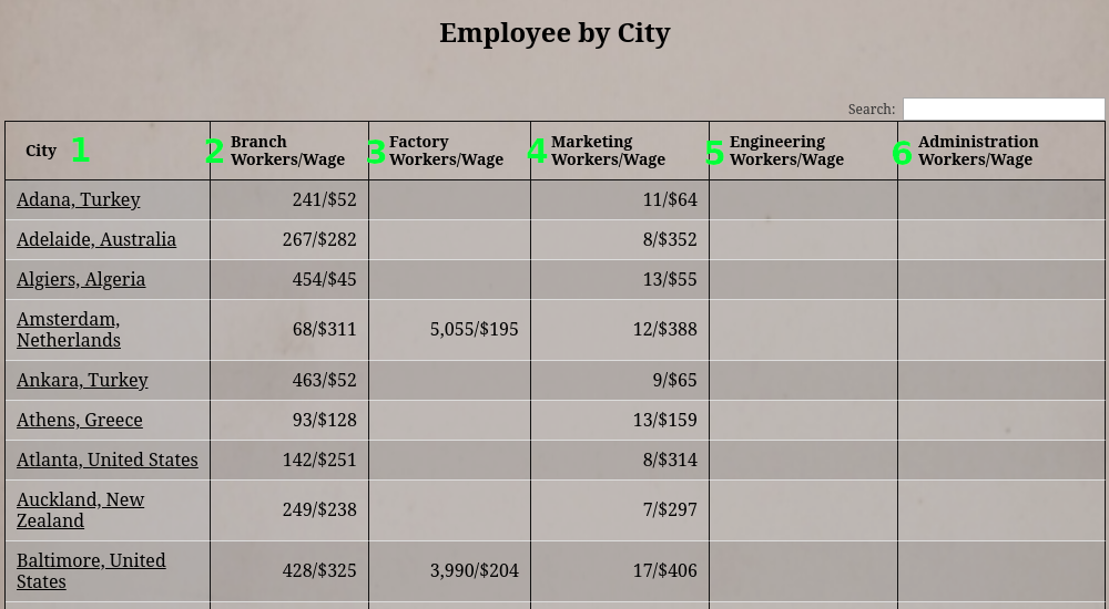 The table then shows the city's Branch (#2), Factory (#3), Marketing (#4), Engineering (#5), and Administrative (#6) employee count and average wages.
