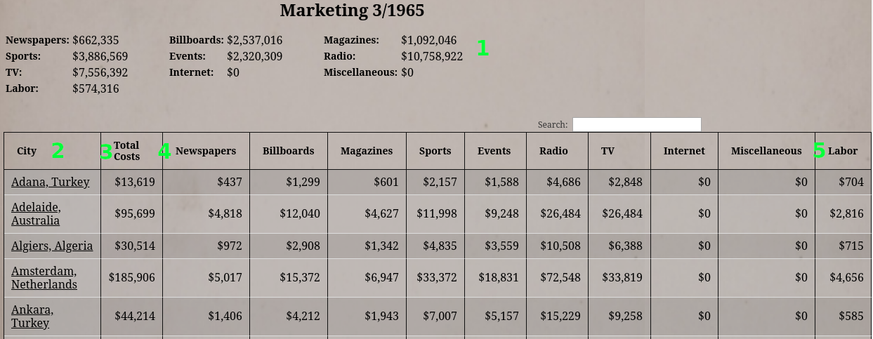 The Marketing report displays your marketing budgets for the month. At the top (#1) is a summation of your marketing expenses for your company in each category. It also contains your total labor costs.