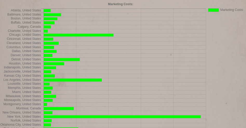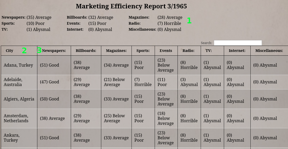The table lists every city you're marketing in (#2). And then table breaks down your efficiency in each category for that city (#3). Your marketing efficiency is directly related to your marketing budget, how long you keep that budget, and your marketing skills.