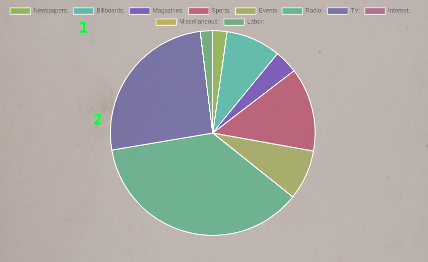 The Marketing report also contains two charts. The first of these is a pie chart that displays the total marketing expenses for your company. Above the graphs are colored blocks (#1). These blocks correspond to the colors on the graph. You can click these blocks to toggle the display of this category in the graph (#2).