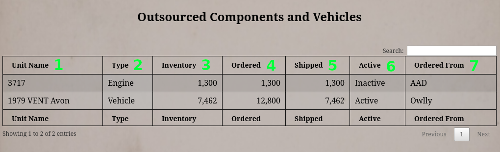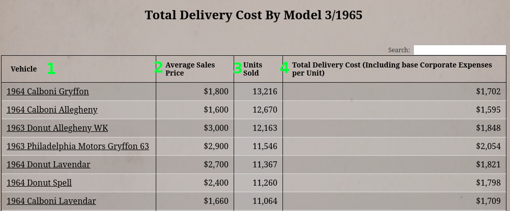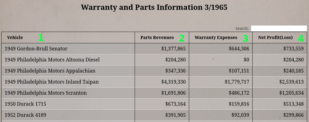 Each vehicle model you sold in the last seven years has an entry in the table (#1). You can find the parts revenues in the next column (#2). Parts revenues come from vehicles sold that you sold three years ago or more. The amount of part revenues you get depends on the unit costs of the vehicle, the model's quality rating, how many you sold, and how long ago you sold them. Over time, you will get fewer parts revenues as aftermarket suppliers take over from your OEM supplies.