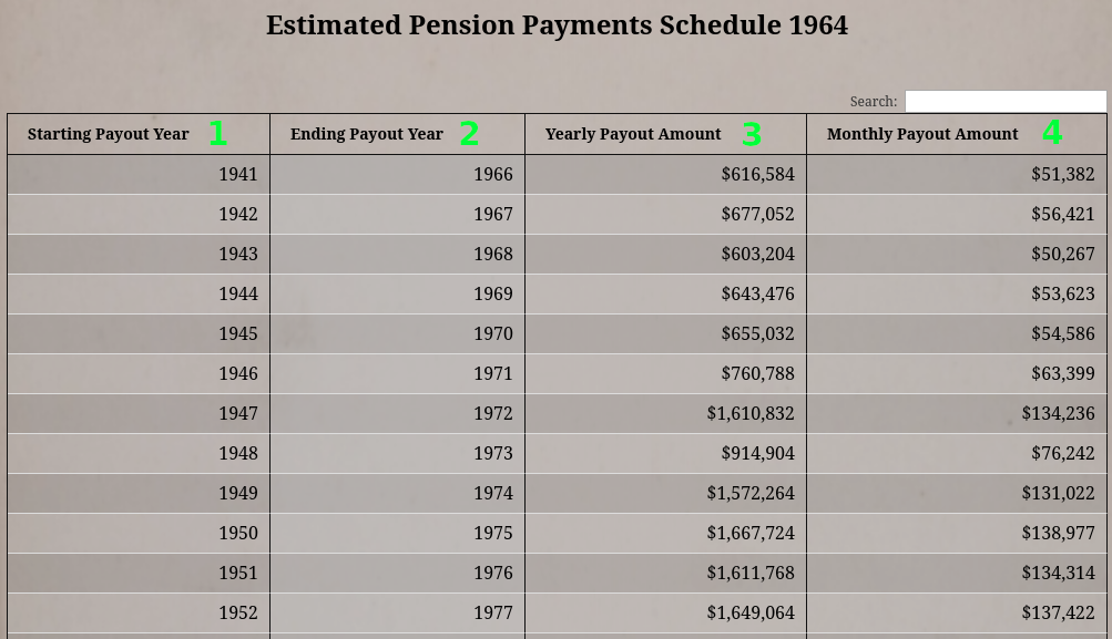 The table lists every year that employees retired (#1). And the year they're not expected to be paid anymore (#2). The amount of money paid to them out of the pension funds per year is in the “Yearly Payout Amount” column (#3). And that value broken into monthly payments is in the last column (#4).