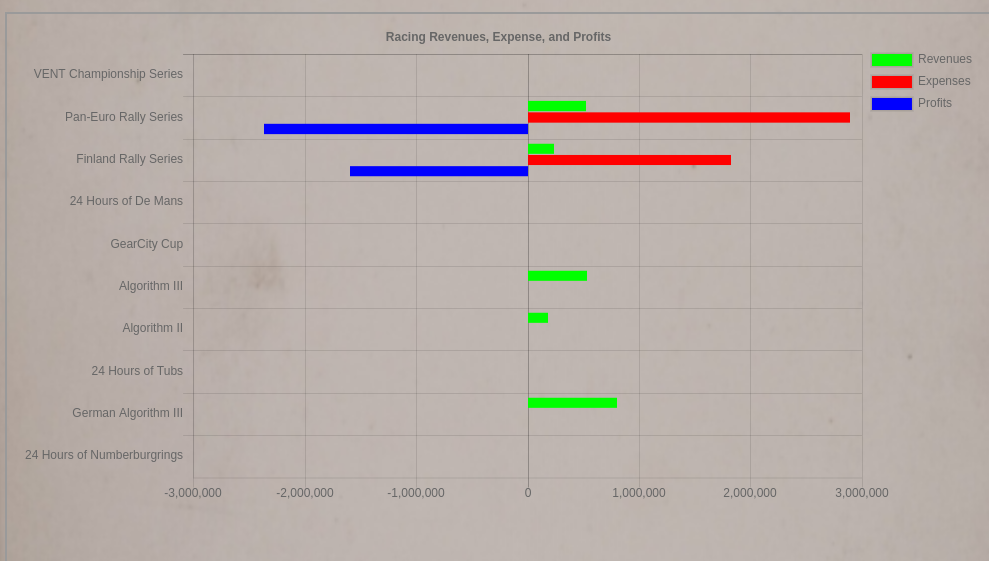 The Racing Report also contains two bar charts. The first chart shows your revenues, expenses, and profits for each active series you're racing in.