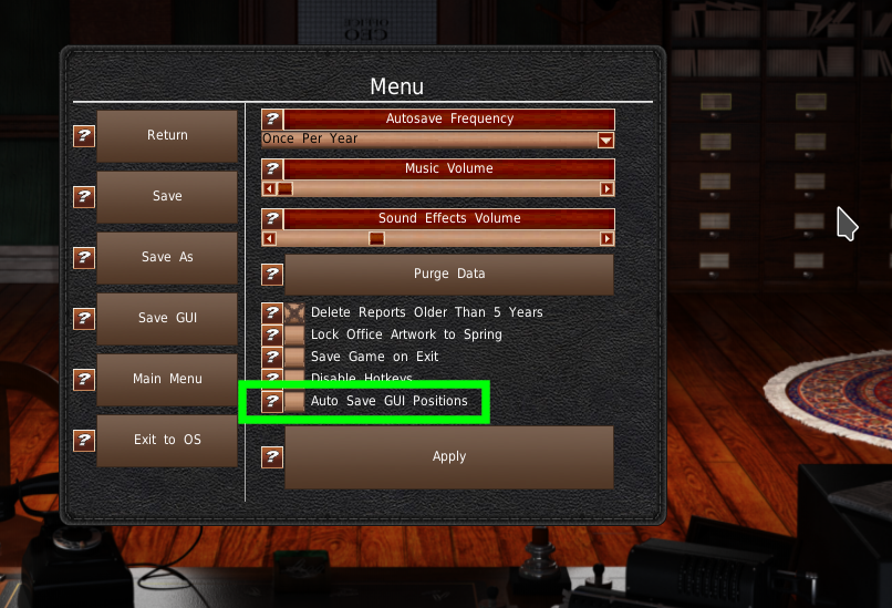 GUIの位置を自動保存の設定を使用して、ウィンドウの位置とサイズを自動的に保存するように設定することもできます。この設定は、ゲーム内のオプションメニューにあります。このメニューは、オフィスのゲームメニューにあります。ファイルキャビネットをクリックするか、トップバーからメニューボタンをクリックするか、オフィスにいる間にESCボタンを押します。