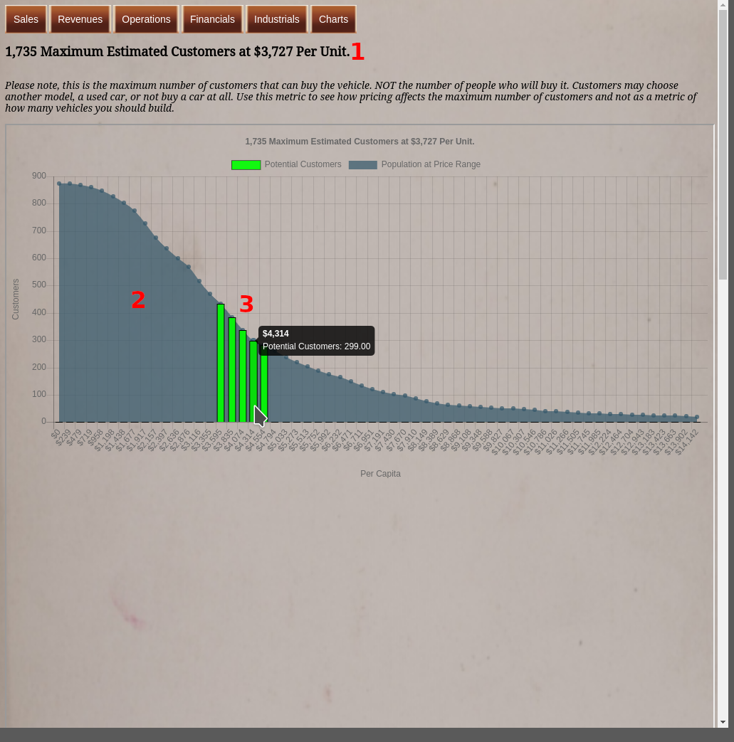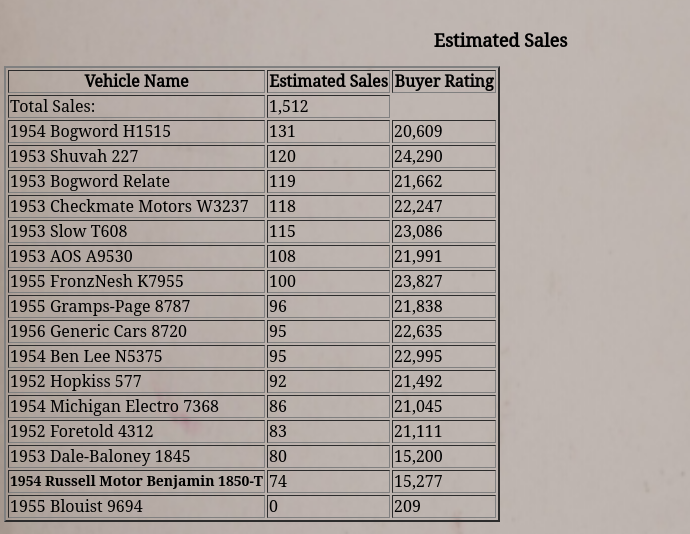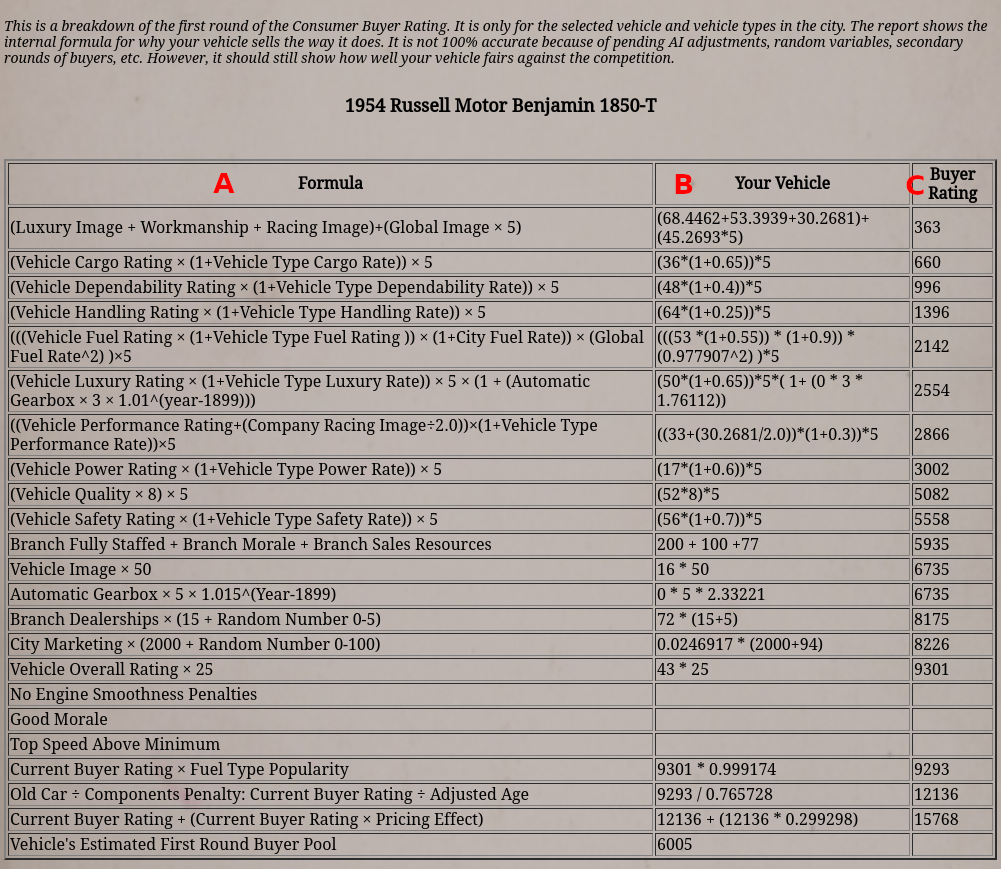 内部的には、このゲームは、あなたの提供する車両をバイヤーの評価と呼ばれる単一の変数に定式化します。そして、このバイヤーの評価を使って、同じ車種の他のモデル、ターゲット層、および経済層と比較します。そして、このバイヤーの評価といくつかの追加情報に基づいて、販売台数を配分します。