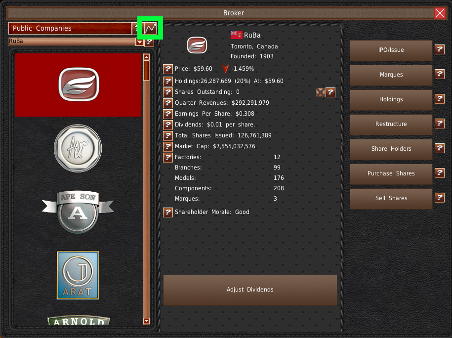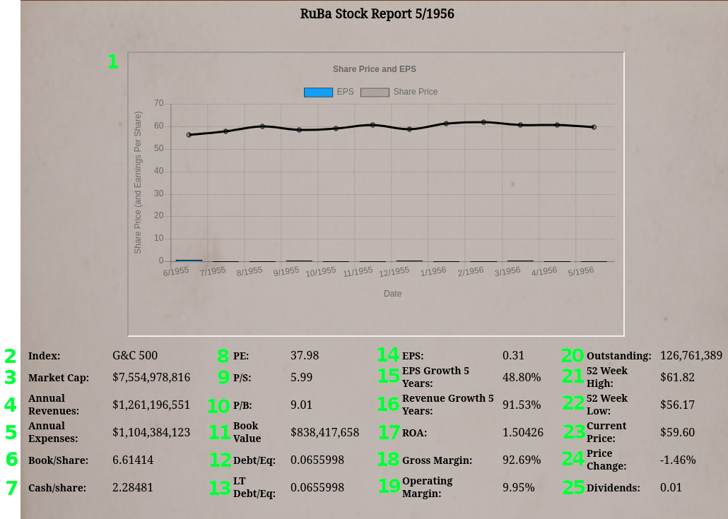株式レポートには、選択した銘柄に関する追加情報が含まれています。ゲームは株式レポートを動的に生成し、あなたは株式ブローカーウィンドウにある動的レポートボタンを介してのみアクセスすることができます。このボタンは、会社選択のドロップダウンボックスのすぐ上にある上場企業ヘッダーの横にあります。