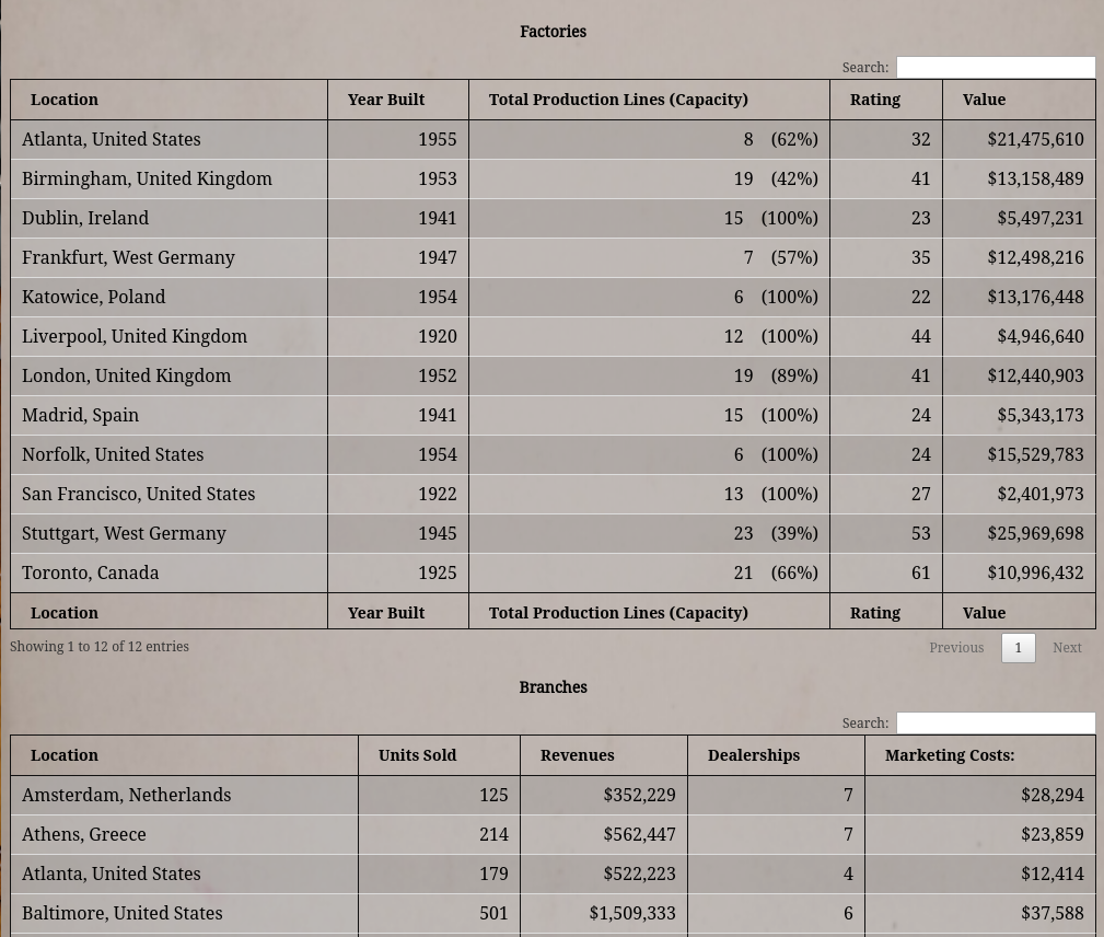一番上の表が工場表です。これは、その会社のすべての工場、工場を建設した年、生産ラインの能力、総合評価、および価値を表示します。