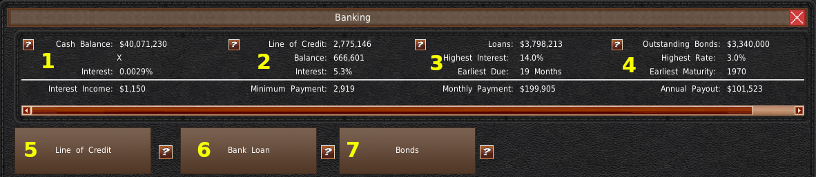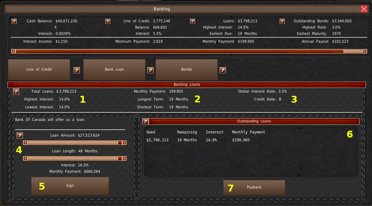 銀行融資のパネルの上部には、あなたの合計融資額、あなたが支払う最高、および最低金利 (#1)を見つけることができます。中段には、毎月の支払額と、最長と最短の融資が終了するまでの帰還が表示されます。パネルの右上には、グローバル金利とあなたの信用格付けがあります。この2つの変数が、融資のオファーと金利に影響します。