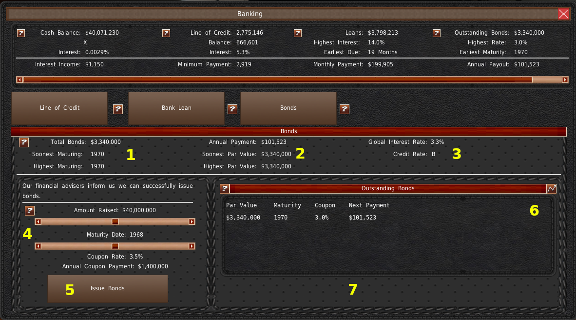 右側には、あなたの発行済み社債リスト(#6)が表示されます。このリストには、あなたが発行したすべての未発行債券が含まれています。信用供与枠とは異なり、複数の債券を発行することができ、高い額面金額を返済したり、クーポン利率を下げたりすることも推奨されているほどです。