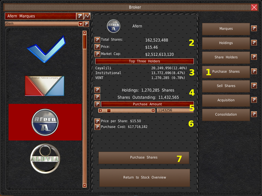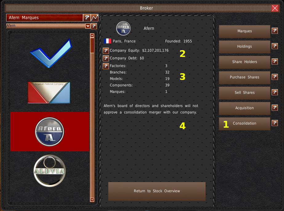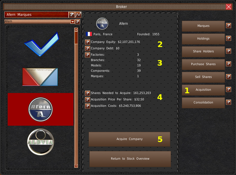 オファーする準備ができたら、「会社の買収」ボタンをクリックします(#5)。多くの場合、AI企業は利益が出ていれば、あなたの買収提案を拒否します。100%確実に購入できるのは、50%以上の株式を所有している場合のみです。企業買収の試みは1ターンに1回しか行えません。
