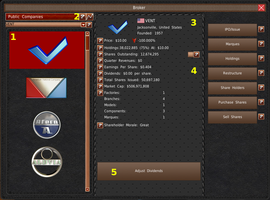 中央のパネル(#4)に企業の配当が表示されています。配当とは、企業が四半期ごとに行う1株あたりの支払いのことです。配当は株主を幸せにします。「配当を調整」ボタン(#5)で、自分の配当と、過半数を所有している会社の配当を調整することができます。