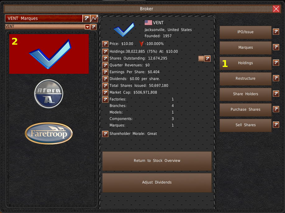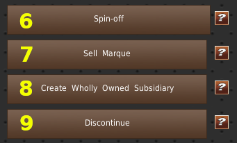 「スピンオフ」ボタン(#6)は、この銘柄をあなたが運営しない独立した会社に変えます。この会社の所有権は、あなたの株主の間で分割されます。つまり、あなたが会社の70%を所有している場合、このスピンオフの70%を所有することになります。