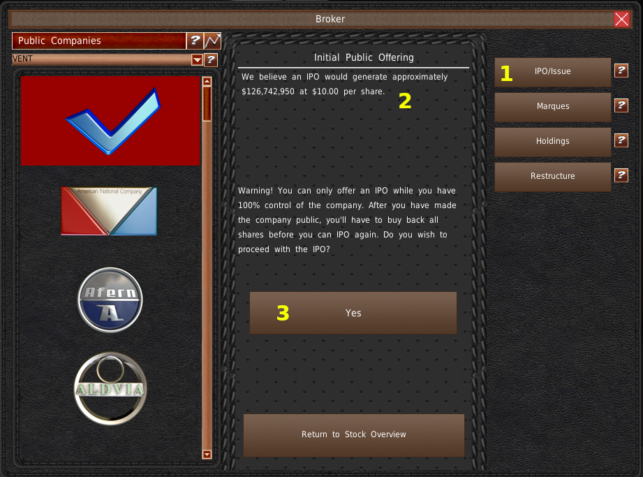 株式システムを開くと、最初にあなたの会社が選択されています。もしあなたの会社が株式公開されていない場合、ゲームのデフォルトはIPOの画面になります。IPOとは、会社の一部を一般公開することです。その後、オーナーはその株式を売買することができます。あなたは最初に売った株式の代金を受け取ることができます。