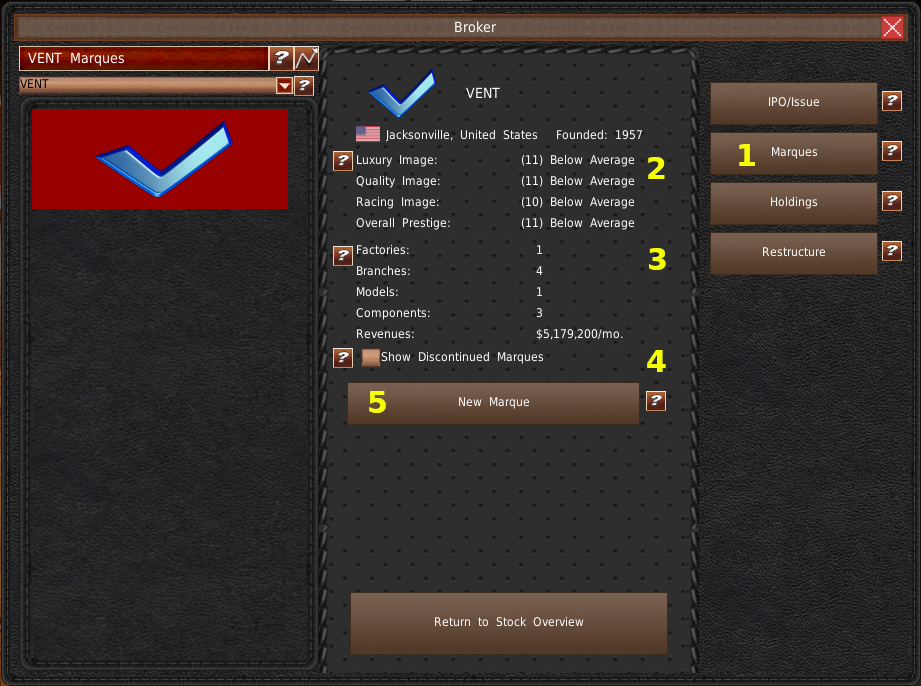 ブランドとは、企業が自社の一部として運営する銘柄のことです。これらのブランドは、会社から独立して運営されているわけではありません。プレイヤーの会社が選択され、「ブランド」ボタン(#1)をクリックすると、このパネルが表示されます。このパネルでは、左側に自分の会社のブランドのリストが表示されます。リストから会社を選択すると、その会社の情報が中央のパネルに表示されます。