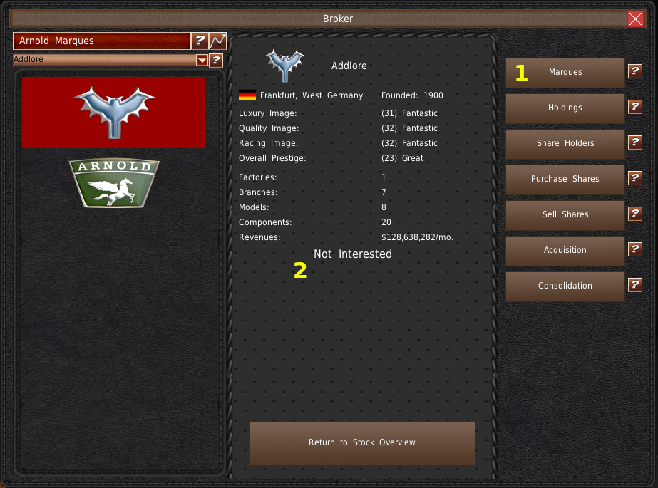 AI会社を選択した状態で「ブランド」ボタン(#1)をクリックすると、その会社のブランドを一覧表示します。リストから企業を選択すると、中央のパネルにその企業の情報が表示されます。プレイヤーのブランド選択と同様の情報が表示されます。ただし、このパネルの一番下には、親会社からそのブランドを購入するオプションがあります(#2)。もし、その会社が売却に興味がない場合は、「興味なし」と表示されます。そうでない場合は、この場所に買収ボタンが表示されます。
