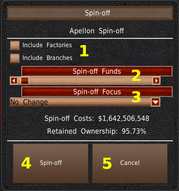 会社をスピンオフさせる場合、このようなウィンドウが表示されます。銘柄の売却や廃止のウィンドウも同じような感じです。一番上のチェックボックス(#1)には、スピンオフによってブランドが所有する工場や支店が表示されます。資金のスライダー(#2)は、あなたがブランドに与える開始資金を調整するために使用します。そしてフォーカスのドロップダウン(#3)は、スピンオフするブランドのAI動作値を変更します。