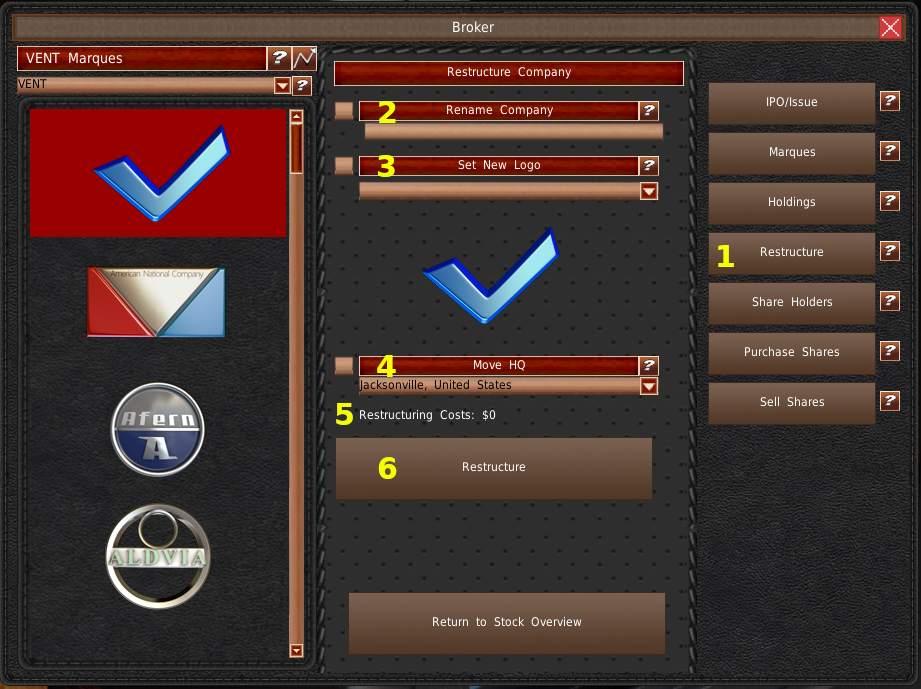 ロゴの下には、本社を移転できるシステムがあります。ドロップダウンを使って本社の都市を選択します(#4)。便利すぎないように、選択できるのは自分が所有している本社ブランドの都市のみです。本社の変更を行うには、チェックボックスを有効にする必要があります。