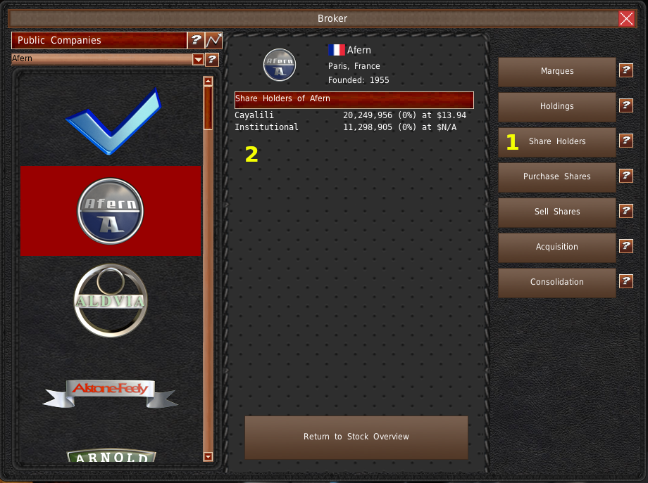 株式は、企業の一部を所有することです。株式システムでは、会社の売買、合併、新規設立が可能です。トップメニューの「ブローカー」をクリックすると、株式システムにアクセスできます。または、金庫の中にある株券の山をクリックしてください。