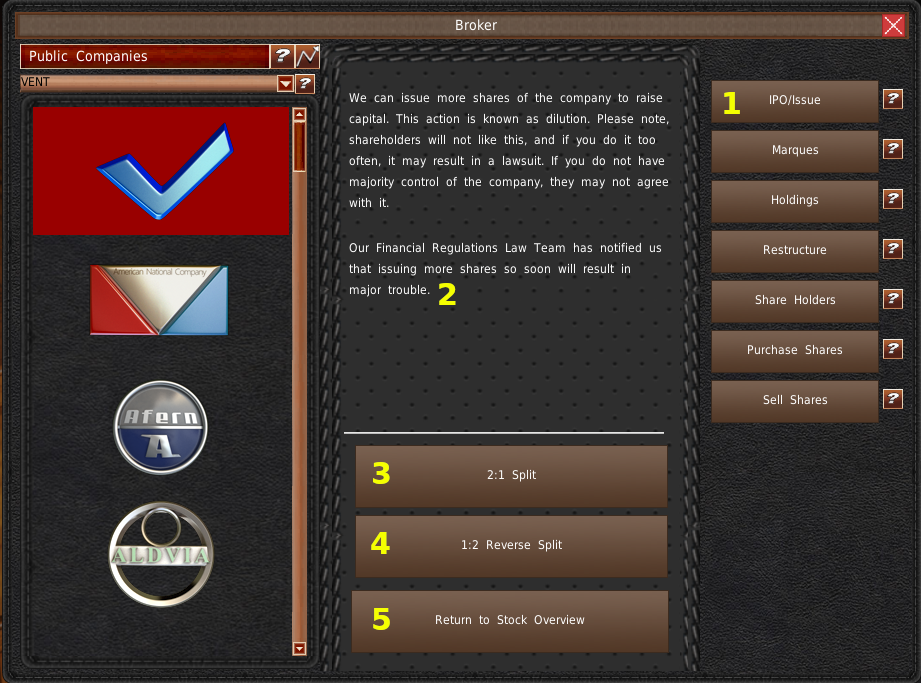 また、株式を分割して株数を増やしたり減らしたりすることも可能です。株の価値が高くなりすぎると、自動的にこれを行います。「2:1の株式分割」ボタン(#3)で通常の分割を行うことができます。また、「1:2の株式併合」ボタン(#4)で逆分割も可能です。株式概要パネルに戻るには、「株式概要に戻る」ボタンをクリックします(#5)。