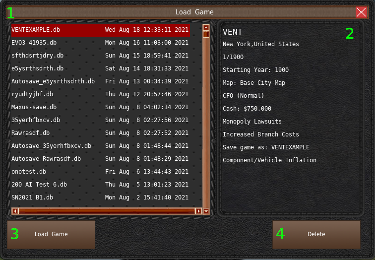 GearCity はとても長いゲームです。一度にすべてのゲームをプレイするのは難しいでしょう。そのため、どこかの時点でゲームをセーブしたいと思うでしょう。そのセーブゲームをロードするには、ロードゲームウィンドウを使用する必要があります。