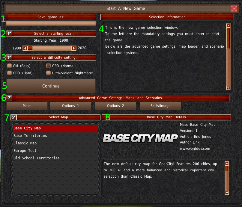 - セーブ名の設定(#1)、マップの選択(#7)、開始年の設定(#2)、難易度設定(#3)、オプションの設定(#7)が完了したら、続けるボタンをクリックしてください。このボタンを押すと、本社選択室に移動します。