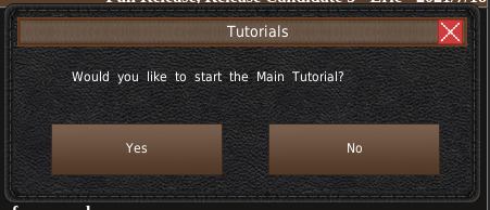 チュートリアルを有効にしている場合、画面中央にはメインチュートリアルのポップアップが表示されます。メインチュートリアルを開始したい場合は、はいをクリックしてください。このポップアップを出さないようにするには、チュートリアルシステムを無効化にする必要があります。メインチュートリアルを行っても、このポップアップは消えません。しかし、無視するか、Escapeキーを押すか、閉じるボタンをクリックしてください。チュートリアルのポップアップやヘルプシステム全般についての詳細は、ヘルプシステムのページをご覧ください。