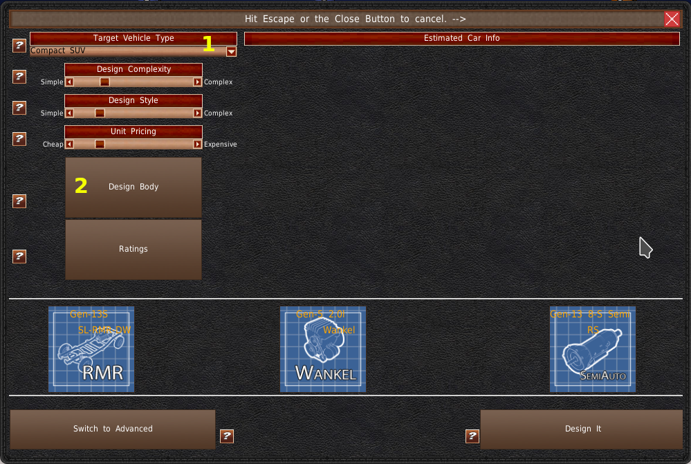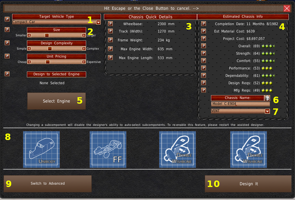 右下に、2つのボタンがあります。クイックグレードボタン(#3)は、ボディデザインとアドバンスドデザイナーをスキップします。ゲームはすぐに古いボディを使ってエンジニアリングプロセスを開始します。設計するボタンを押すと、アドバンスドデザイナーに移動し、車体の変更やスライダーの調整を行うことができます。なお、スライダーの調整をしすぎると、コンポーネント選択の割引ボーナスがなくなるので注意してください。ゲームでは、その車両が一から設計されたものとみなされます。