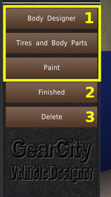 ベースとなる車体を選択すると、画面の左側にデザインメニューが表示されます。上部には車体をデザインするための3つのボタン(#1)があります。これらのボタンについては後ほど説明します。