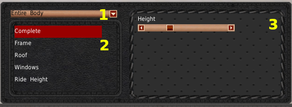 パネルの上部には、ボディの位置を表すカテゴリーがドロップダウン(#1)で表示されています。このドロップダウンからカテゴリーを選択すると、下のリスト(#2)にサブカテゴリーが表示されます。このリストからサブカテゴリーを選択すると、そのサブカテゴリーに関連したアニメーションが読み込まれます(#3)。スライダーを使用して、デザインルームで車体を変更することができます。